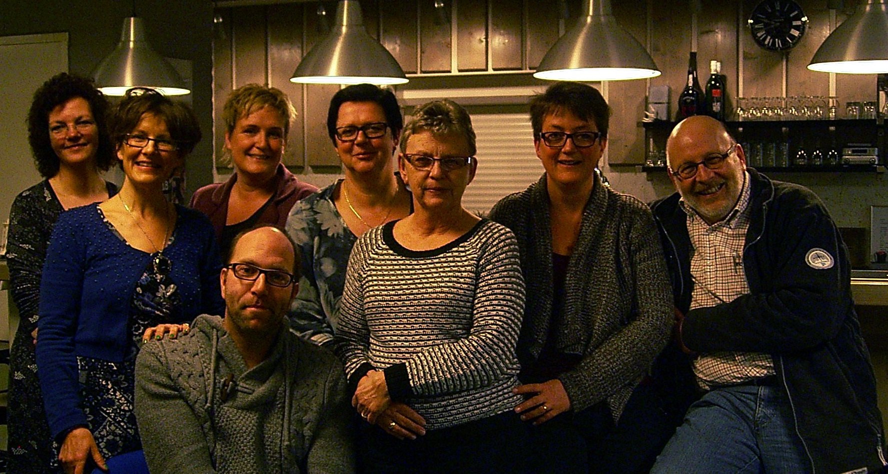 V.l.n.r. Marrie Buis-Bosch (tijdelijk stand-in voor Magrietha) Elsie, Evelien, Bertus, Willeke, Teunie, Ilse en Arjan